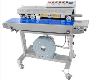 Máquina de sellado continuo con banda transportadora, codificación e inyección de aire.