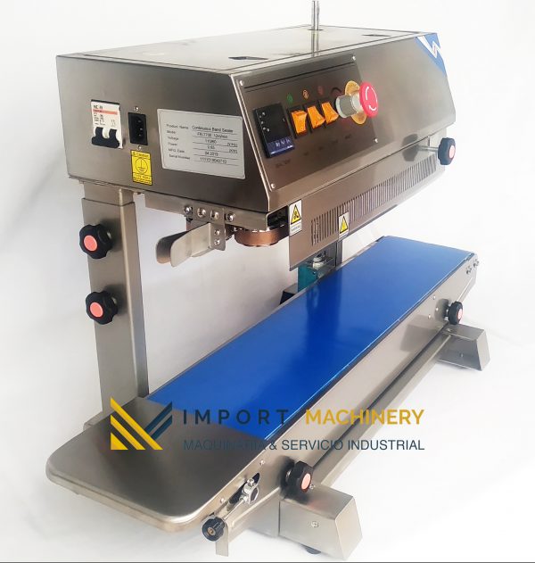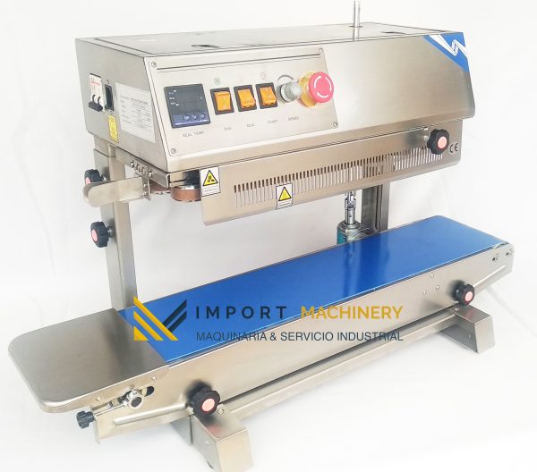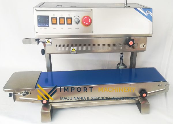 Máquina de sellado continuo vertical con banda transportadora y codificación.